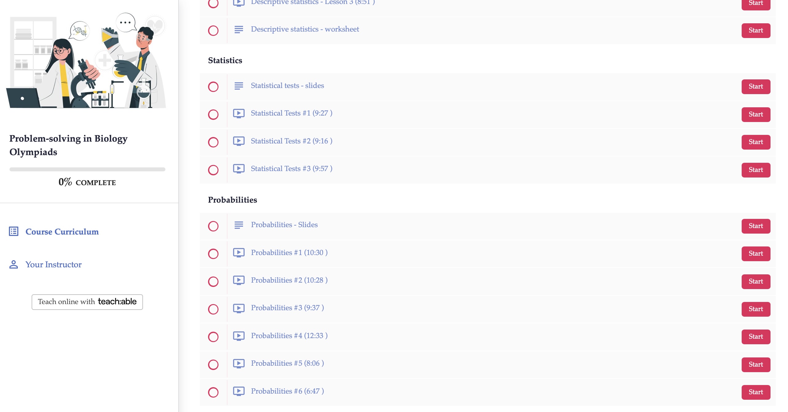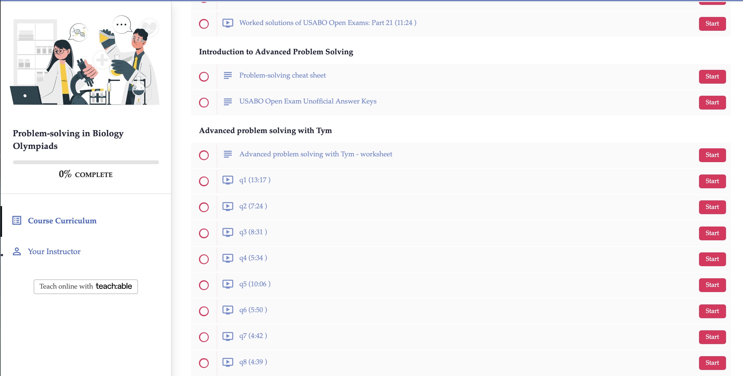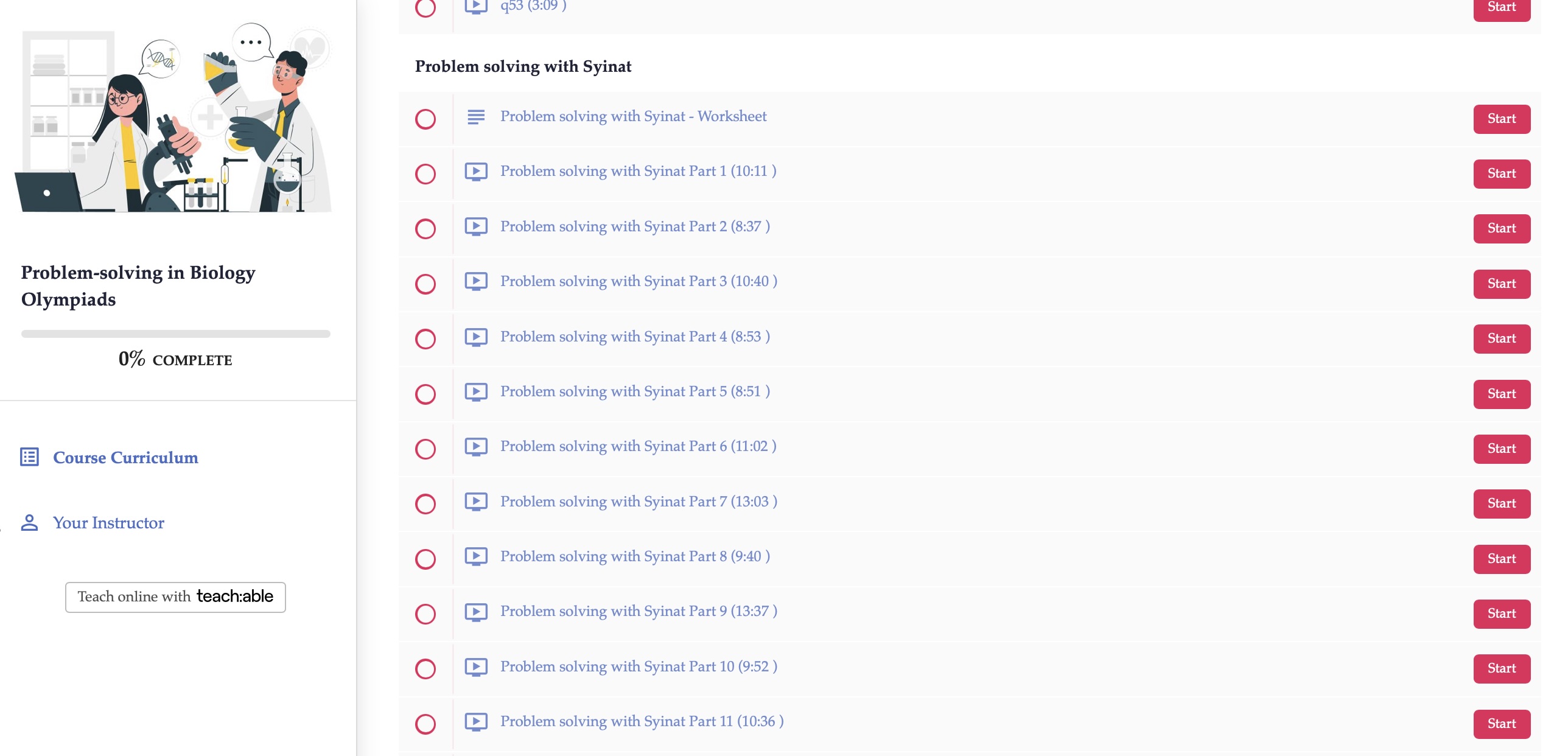 The course is delivered completely offline. Students will be able to access the Teachable platform where they will find videos with step-by-step explanations of the most complicated biology olympiad questions.